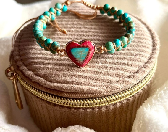 Bransoletka na regulowanym sznurku z turkusu z sercem to wyjątkowy dodatek, który łączy naturalne piękno kamienia z subtelnym, symbolicznym akcentem miłości i harmonii.